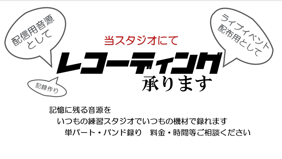 バンド録音:1時間3750円 2名での録音:1時間3000円 1名での録音:2500円